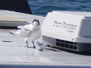 Though it seems we are the only ones out there in the middle of the ocean, (except for the occasional passing ship) there is always one constant, the seagulls. Rain, shine or wind, they are always perched upon our buoys or the A-frame. I sometimes sit and watch their actions. There may be six or seven lined up across the A-frame, bobbing with the ships every movement. Then, another one will fly towards the gull on the end of the frame, hover around him until he flies away, and then takes his spot. I’ve seen them do this a hundred times and could never figure out what or why they do this. Was it a game or just a more dominant gull enforcing his rights? This is still a mystery to me. The one thing that truly amazes me is when I find a teeny tiny bird, all by itself resting on our deck. How does this tiny little creature, with a 3” wing span somehow find itself in the middle of the ocean? I know it must be scared, as well as totally exhausted. They are usually hiding on top of one of the connix boxes or behind a piece of equipment. When I would see one of these birds, I would put out a small cup of water with sugar in it and cut up small pieces of bread. I would then leave him alone to eat and rest. When I would return a bit later, he would almost always be gone. Deep down I felt perhaps I helped him along his journey.