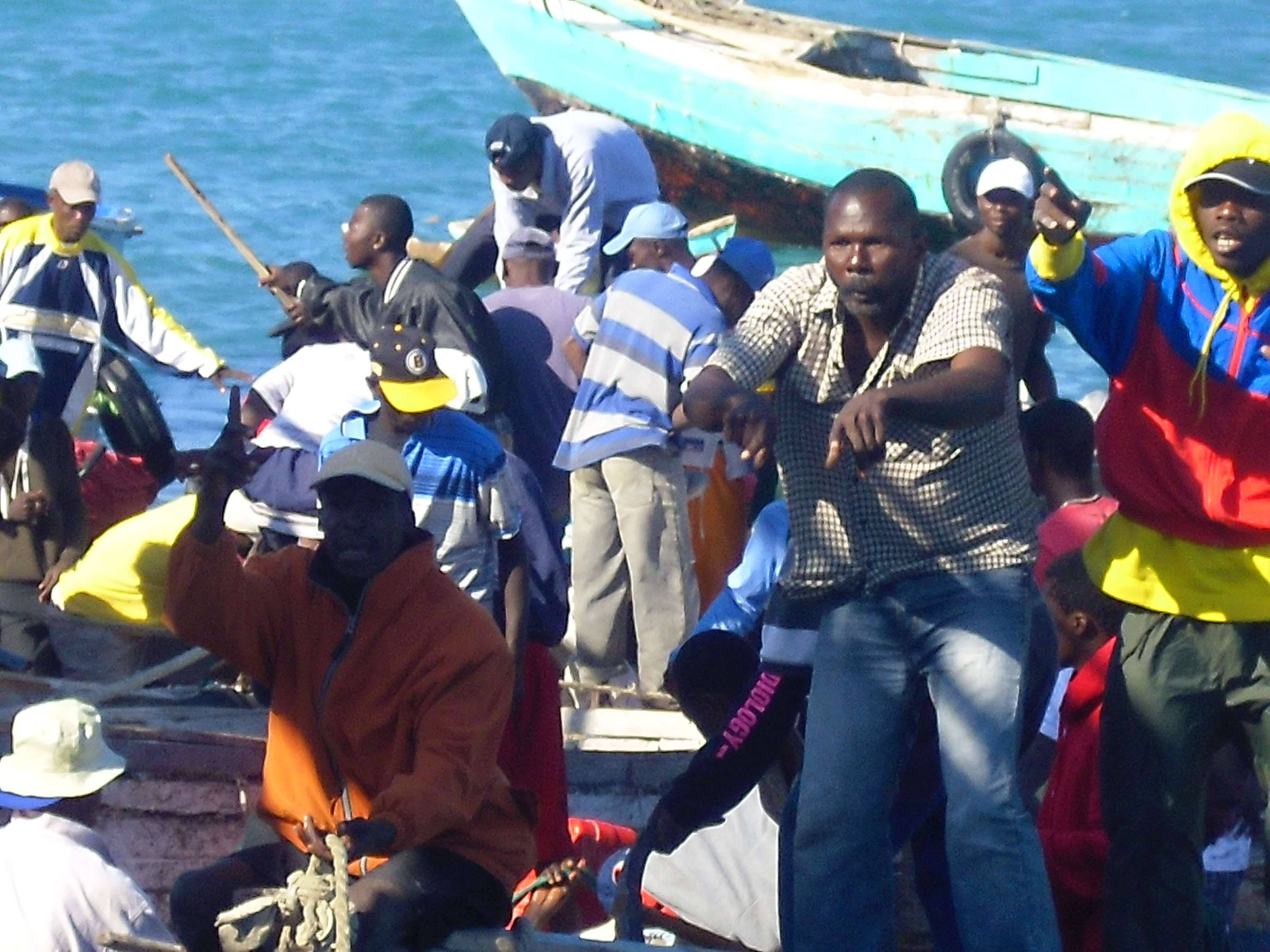 It seemed unusually hot that 3rd afternoon as I stood on the fossil deck and fanned myself to catch a breeze. The activity was humming along when I noticed a much louder commotion coming from a couple of the small Haitian boats. A handful of men seemed to be arguing when one shoved the other. A few around them tried to calm the situation but didn’t seem to be working. Before long, instead of just three or four arguing, it was now seven or eight men. I saw a couple of the crew walk over and try to defuse the situation. When nothing happened, we had Kikki (one of our Haitian helpers) yell through his megaphone that unless they stopped we would not continue unloading. This also did nothing to change the situation.