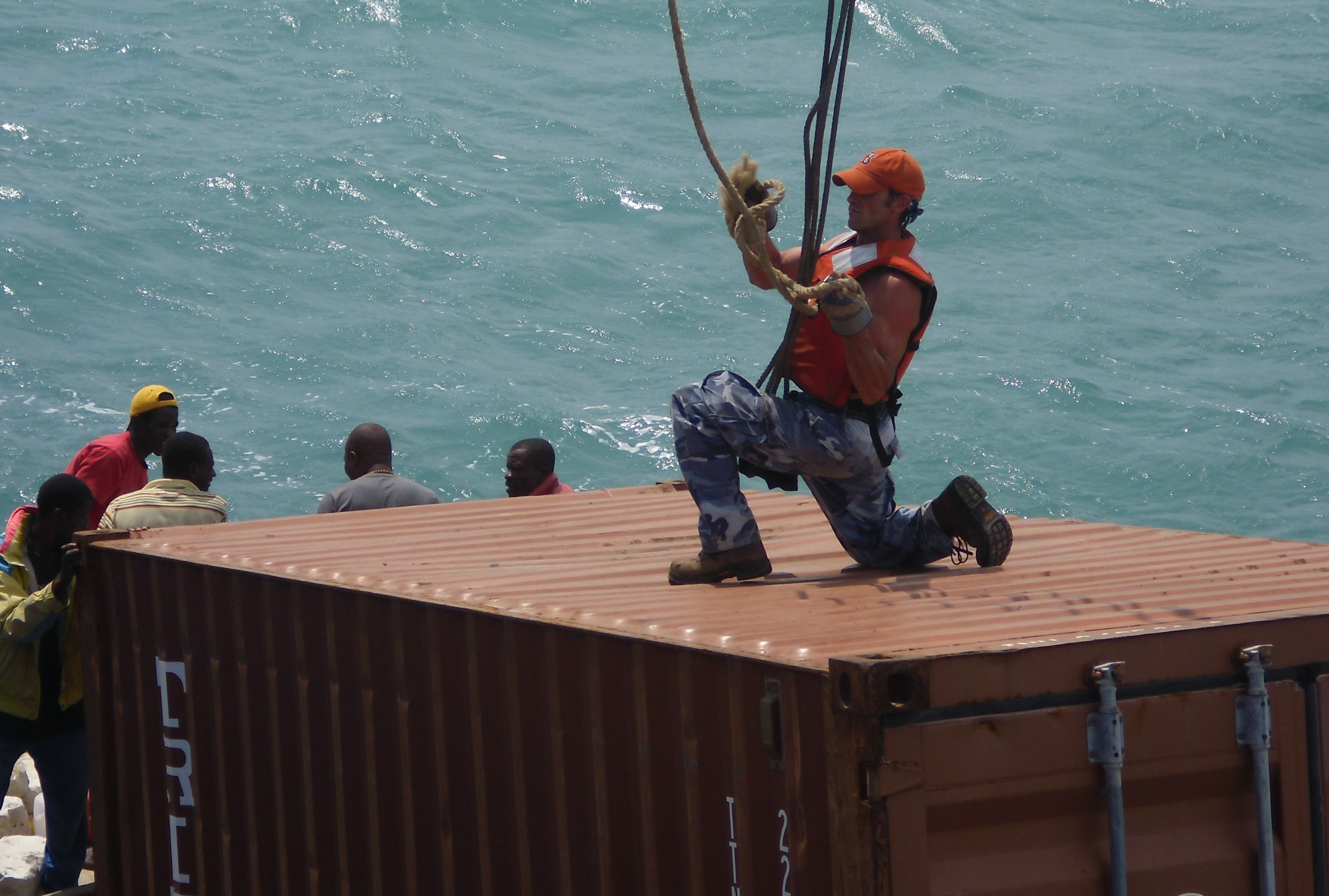 When the first container was securely hooked on all four sides, Alex raised his hand to Brian seated in the crane and gave the motion to begin. There was no doubt in my mind, that at that very moment, everyone held their breath. Slowly the cables became taut and the container was lifted a few feet off the deck. Some of the other crew had ahold of ropes that were secured to the container so as to help control its movements. Once it was stabilized, Brian lifted it up even higher. As he carefully swung it over the edge of the ship, the wind caught it and it started to swing back and forth. My stomach was in knots. Just below was a boat with four or five Haitians looking up at this huge container dangling about 10 feet above their heads. I don’t know how they didn’t panic, because I sure would of.