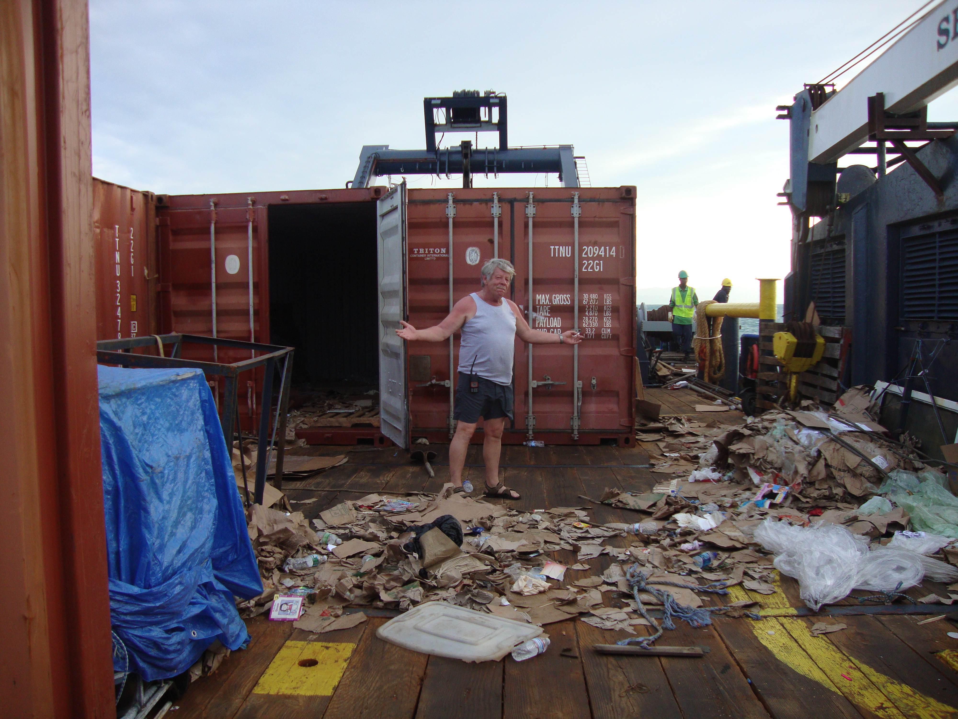 Once all the ten containers were taken ashore to Les Caye, we went about cleaning the deck of the M/V Sea Hunter. There were mounds of trash left behind and we were ready to get our “home” back to normal. With everyone chipping in, it didn’t take long.