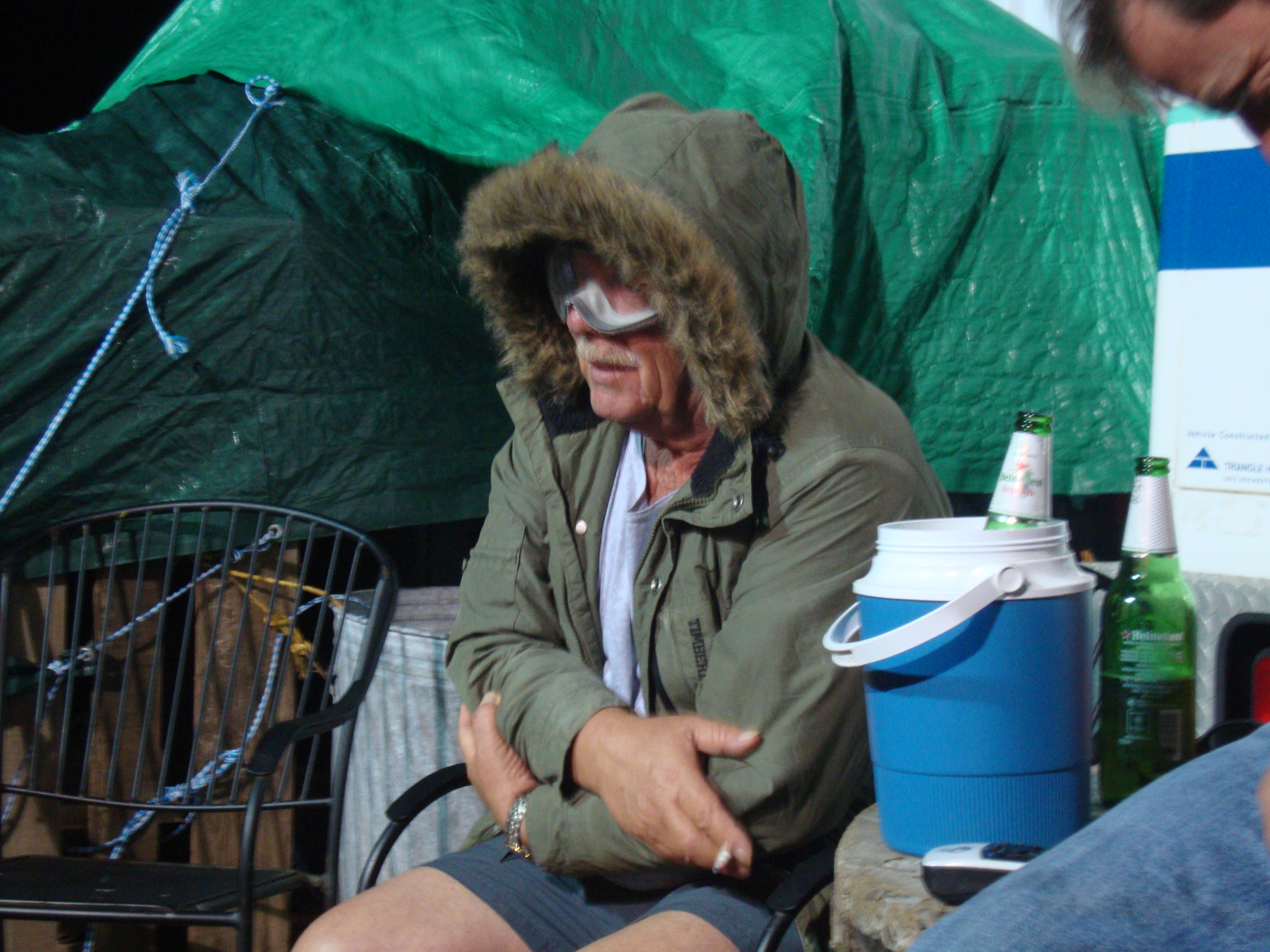 The night was warm as we sat around the deck reminiscing about the trip and laughing at our many struggles and stories. The music was blaring our favorite tunes as some of us sang along. It was a wonderful feeling to just cut up with my fellow crew mates. All of a sudden Greg walks out from the galley wearing a green parka with a fur collar pulled up over his head. We immediately cracked up as he looked ridiculous! He said he was freezing and that was all he could find.